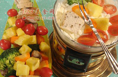 5、将原料摆盘与奶酪火锅同时上桌,边聊边涮,要有叉子叉着菜和水果涮,千万别不小心掉原料在火锅里啊,会被罚跑圈的哈哈。