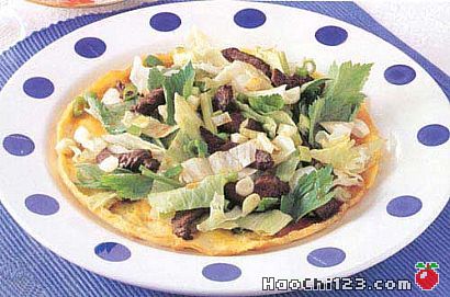 1、葱洗净,切末;牛肉片放入碗中加入A料拌匀并腌10分钟;鸡蛋打入碗中加入B料搅匀成蛋汁,倒入平底锅中煎成蛋皮,盛出,铺入盘中备用。
