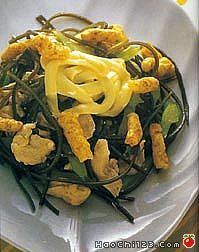 1、水发海带洗净、控干,切成长方形片,入锅煮软、捞出,控干。