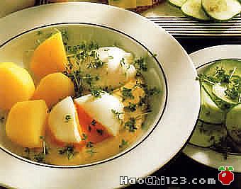 3、将马铃薯的煮水倒掉,然后盖着锅盖摇晃一番,冷却一会儿,让热气散去。取出马铃薯,摆在盘上。将蛋壳剥除,放入盘中间,之后淋上芥末酱。水田芥剁碎,取一半洒在蛋上面。