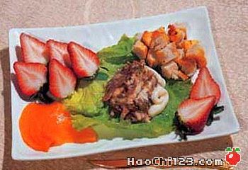 将奇妙酱和白兰地酒混合,制成沙司料。金枪鱼和白兰地沙司料拌匀放生菜上,配上蒜香面包粒。草莓用刀一分为二,黄桃切片,装盘即可。
