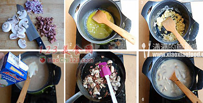 7、将炒好的蘑菇、洋葱、火腿丁倒入正在熬的汤中一起煮。