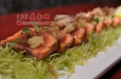 2、平底锅烧热,把三文鱼快速四面煎成金黄色,迅速放入冰水中,待一冷却,取出,改刀切片,在盘子中心先放上高丽菜丝,把切好的三文鱼码在上面,依次淋上柠檬醋、在摆上姜泥、葱花、目鱼花,即可。