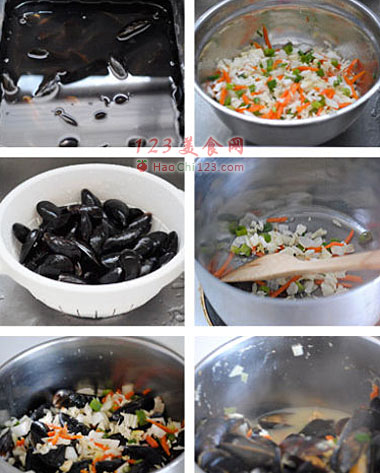 5、转小火,放上一层mussels,再撒蔬菜,加少许盐和白胡椒。如此重复一层层地铺上去。加盐是为蔬菜调味,海鲜本身有咸味,所以盐要少加一点。