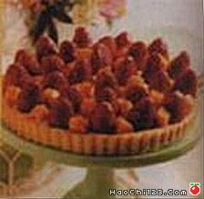4.将鲜草莓和黄桃丁整齐地摆放在烤好的圆型果料馅饼上即可。