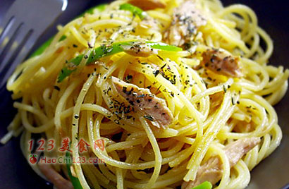 意面200G、金枪鱼罐头4汤匙、青尖椒半个、蒜两瓣、盐1茶匙、干罗勒叶碎适量。