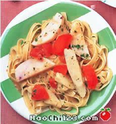 6. 捞起作法4的义大利麵放入作法5的酱汁锅中拌煮1~2分鐘后,再加入巴西利末拌炒一下,即可起锅装盘。