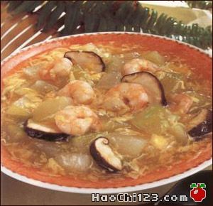 3、清鸡汤煮滚,加冬瓜煮至软;再加鲜冬菇及虾仁煮熟。