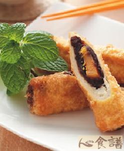 4.热油锅,将油温烧热至约120℃,放入作法3的土司卷油炸至表面呈金黄色,捞出沥干油脂即可。