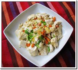 1、把豆腐切块,在加了盐的开水锅里焯一下捞起备用,红萝卜切丁、小葱切段备用;