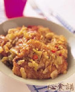 里肌肉片6片,咸菜2杯,辣椒2根,蒜末2大匙,1.酱油2大匙,木瓜粉1/3大匙,糖1/2大匙,香油1/3大匙,白胡椒粉1小匙,沙拉油1/2大匙,2.面粉1/3杯,蛋1个,水3大匙,3.地瓜粉1/3杯,太****1/3杯,4.盐适量,糖1大匙,酱油1/2大匙,水适量