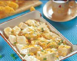2.咸鸭蛋剥皮后,取出蛋黄切小丁,放在豆腐上,再撒入切碎的葱花;