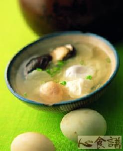 (2)将生咸鸭蛋打入高汤内煮1~2分钟,外表蛋白略熟后,再放入九孔一起煮3~5分钟,然后加入调味料,拌均即可熄火盛入碗中,洒上葱花即可食用。