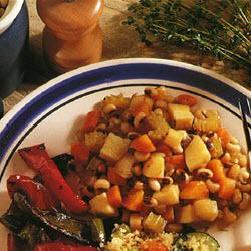 干黑眼豆(眉豆)150克,橄榄油2汤匙,大洋葱2个,剁碎,大胡萝卜2根,剁碎,西洋芹菜4茎,剁碎,大蒜2瓣,剁成末,水1公升,蔬菜汤725毫升,马铃薯225克,去皮,切丁,芜菁225克,去皮,切丁,干百里香1/2茶匙,干迷迭香1/2茶匙,现磨的黑胡椒粉适量
