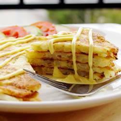 2.用个大锅,将油用中高火烧热。用一大勺的量舀到锅里,然后稍微按扁些,每边煎大约4分钟直到变金黄。趁热食用即可。