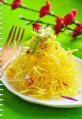 3.锅内加油烧至七成热把土豆丝下入炸至金黄酥脆捞出控油。