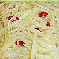 3.等土豆丝变成半透明时,加入适量白醋、精盐,再快速翻炒几下,炒匀。
