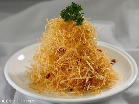 2)锅置火上,添油烧至七成热,下入葱花、红辣椒丝,炸出香辣味,随即将土豆丝、雪里蕻及味精、盐下人翻炒,土豆丝断生即可。
