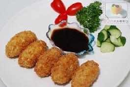 (5)在两个瓷盘上分别撒上适量的小麦粉和面包粉,同时,将一只鸡蛋打入大碗里,加入两大匙清水后搅和。将搓好的圆柱形土豆泥放在小麦粉上滚一滚,使之沾满面粉,接着,在搅和的鸡蛋中过捞一下,然后均匀地抹上面包粉。