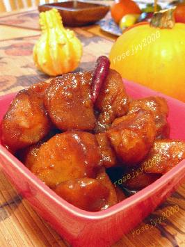 2.反复兜匀,放酱油,少少糖,再放差不多过土豆面的水,慢火焖,焖到土豆粉了,就可用温淀粉打芡,收汁,可上锅了。