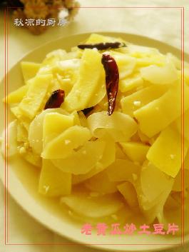 4.炒锅注油,冷油放入花椒粒,随着油温上升花椒出香味,捞出花椒粒不要,放入干辣椒和一半蒜末,炒出香味,倒入土豆片煸炒,这时滴少许白醋(这样也可保持土豆片脆爽),炒至土豆片变得透明时,倒入老黄瓜片,调入盐,再调入适量白醋,翻炒均匀,调入鸡粉即可出锅。