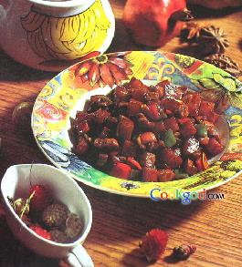 1、土豆去皮洗净,切成1厘米见方的小丁,下入七层热油中,炸呈金黄色时捞出,沥净油分备用。