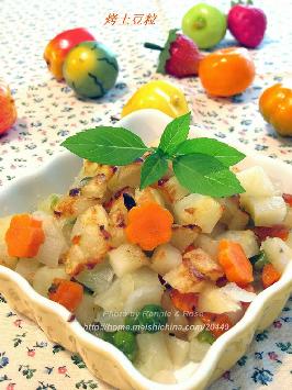 1.把土豆、红萝卜和洋葱切粒,喜欢的也可放点青豆,如果你还有什么材料,您自己也可改变一下,反正都是烤;