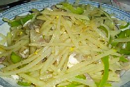 然后锅里放油,烧热(大约2分钟)放肉爆炒一小会,放盐。再放用水泡过的土豆丝(这样才脆)和青椒丝。快炒3分钟放醋,青椒不够辣我就再加了点红辣椒粉。起锅咯。