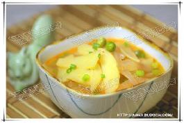 土豆 1个,洋葱 0.5只,豌豆 少许,韩式辣白菜 1.5大匙,葱末 少许,盐适量,食用油适量,鸡汤500毫升