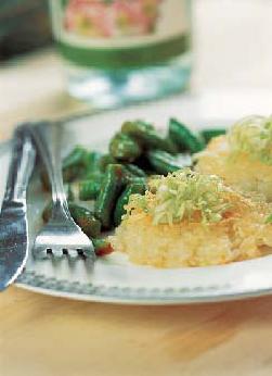 3.四季豆切段,用沸水烫熟,与精盐、辣椒粉、橄榄油拌匀,再与菜饭煎饼一起盛盘即可。