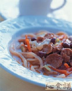 土豆面筋罐头1/2罐,冷藏熟面1人份,高丽菜1/2杯,红萝卜丝适量,盐适量,水1杯,肉丝适量,蒜末适量