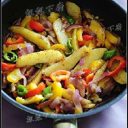 主料:中型土豆两个,彩椒红黄各半个,青椒半个(辣),不能吃辣的也换成彩椒。,紫洋葱半个,土豆切西瓜一样的刀型,其它切粗丝。,调味料:橄榄油,盐,黑胡椒,生抽少许