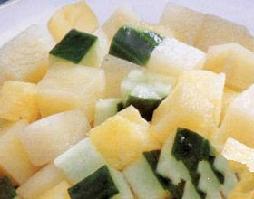 4.将菠萝丁、土豆丁、黄瓜丁加入精盐、白糖拌匀即可。