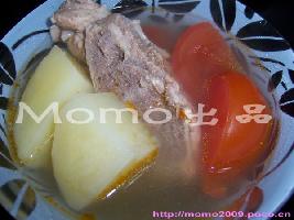 2.将西红柿、土豆、扇骨放入电砂煲中,加入1升清水煲2小时。