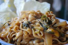 爆锅放土豆丝,炒一会,加豆瓣酱,加荠菜,加足量的水,面条倒在最上面