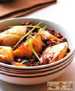 A.马铃薯1颗,B.蒜头3粒,葱1支,猪绞肉100公克,A.甜面酱1小匙,豆瓣酱2小匙,料理米酒1小匙,酱油1大匙,胡椒粉少许,花椒粉少许,B.水100公克,鸡粉1/2小匙