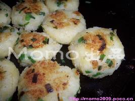 3.将土豆泥揉成一个个小球,再粘上少许葱末在表面,再稍微揉两下,然后压扁。