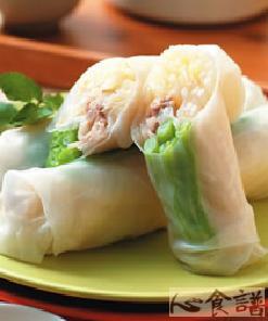 5.取一越式春捲皮,沾水软化后,放入作法2的马铃薯丝,再放上作法3的豆芽及作法4的五花肉片。