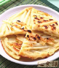 4.热一平底锅,倒入麻油,加入作法2的马铃薯面煳,煎至面煳凝固且两面呈金黄色,取出切成等份,沾作法3的沾酱食用即可。