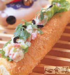 3.长型炸面包中间切开但不切断,夹入作法2的馅料,再排入水煮蛋片、紫高丽丝、萝卜婴丝即可。