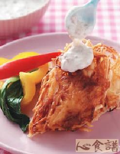 3.取作法1马铃薯丝煳整形成适当大小,放入平底锅以小火煎至熟、两面呈金黄色,取出摆盘,淋上梅子美乃滋淋酱即可。