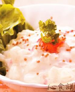 马铃薯150公克,洋葱10公克,红辣椒5公克,芥末籽10公克,小茴香粉5公克,原味优格20公克,美乃滋50公克,白胡椒粉适量,盐适量
