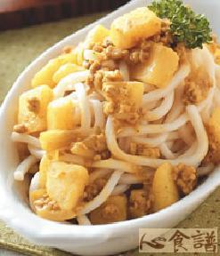 绞肉100公克,马铃薯1个,洋葱1/4个,月桂叶2片,高汤250㏄,熟白面条200公克,咖哩粉少许,盐1/4小匙,砂糖1/4小匙,胡椒粉少许