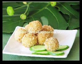 (3)把洋芋泥做成椭圆形,沾上面粉、蛋汁、面包粉,入油锅炸至金黄色。