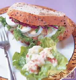 2.将作法1的洋芋与美乃滋、小黄瓜丁、芹菜丁、火腿丁拌匀,夹入面包内,并排入蛋片、紫高丽、萝卜婴即可。