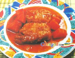 将比目鱼切大片用圆葱碎、西芹碎、盐、胡椒粉、腌制后、拍上面粉、拖上蛋液、用橄榄油煎制成熟。煎盘中倒入奶油下圆葱碎、两芹碎、炒出香味,再加入鸡高汤、月桂叶、口蘑片、番茄沙司、玉米粒、胡萝卜块、大蒜、盐、胡椒粉、比目鱼焖至熟透即可。
