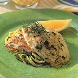 绿皮胡瓜(黄瓜)600克,盐、黑胡椒适量,鳎鱼或鲽鱼4条,每条500克左右,由鱼贩去头及皮,莳萝数枝,细香葱1小束,荷兰芹数小枝,黄油4汤匙,菜油(供涂抹烤盘),柠檬11/2个