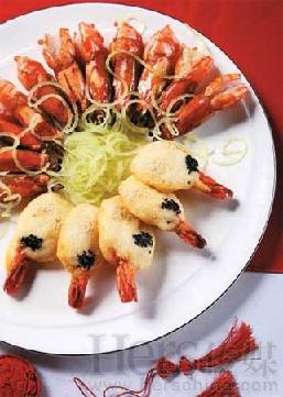 主料:大对虾12只,虾泥200克,菜松(丝)250克,白银耳1朵,香菜一根,樱桃4只,黑芝麻少许,盐,味精,料酒,鸡蛋清,香油,葱姜蒜各适量.