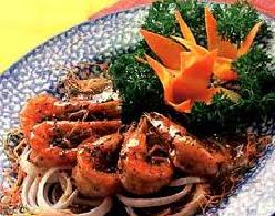 7.将主料摆放盘中。余汁淋花椒油,浇在虾身上即成。