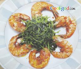3、另起锅注油,下入豆苗,翻炒片刻,烹醋少许,加盐,略炒出锅,盛在大虾中间即可。